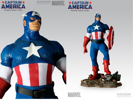 PRODUCT DESCRIPTIONS:Sideshow Collectibles and Marvel Comics are proud to present the Premium Format Captain America Figure! Cap has been reproduced in full 1:4 scale, standing over 19 inches tall atop a rubble-strewn base. Captain America's costume has been expertly recreated with a combination of real fabric and high-quality polystone, a perfect blend of mediums. Each piece is hand-cast and hand-painted to exacting standards. Captain America will be packed inside a durable foam interior, safe for shipment, and a beautiful full color box. Don't miss this chance to add the ultimate Captain America collectible to your collection!