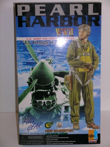 PRODUCT DESCRIPTIONS:Another great 1/6 scale action figure by Dragon. This is a figure of a World War II American pilot from Pearl Harbor (Lt. George Taylor U.S. Army Air Force P-40 pilot). Figure features a highly flexible (12 inch) body, authentic uniform with fully detailed decorations with each piece of equipment accurately reproduced. Equipment includes life vest, goggles, wrist watch, pistol, gun holster with belt, pilots headgear, and parachute.