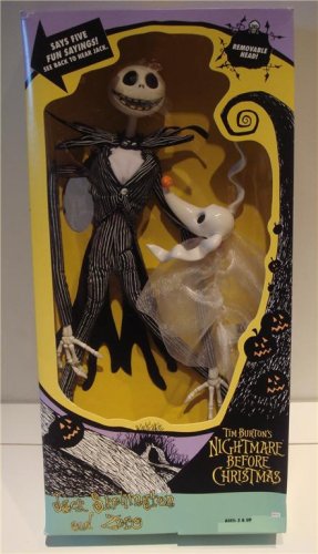 PRODUCT DESCRIPTIONS:From Tim Burton's Nightmare Before Christmas, Jack Skellington & Zero. Jack talks and his head is removable. Hear Jack say: "Merry Christmas"; "Eureka!"; "Fantastic!"; "Perfect!"; or give a fiendish laugh. Zero's ears can be adjusted. Takes 3 A-76 button cell batteries.