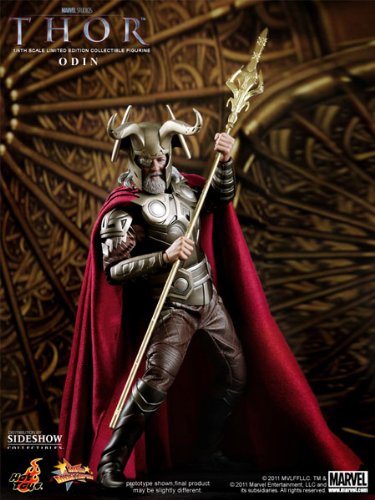 PRODUCT DESCRIPTIONS:The Odin 12 inch figure features: *Authentic and detailed fully realized likeness of Anthony Hopkins as Odin in the Thor movie *Stands approximately 30 cm tall *Muscular body with over 30 points of articulations *Two (2) styles of hair sculpture including one (1) for normal occasion and one (1) for wearing helmet *Movie-accurate facial expression with detailed wrinkles skin texture and beard *Right eye with undetachable eye mask *Eight (8) pieces of interchangeable palms including: *One (1) pair of fists *One (1) pair for holding spear *One (1) piece of left palm with pointing finger *Three (3) pieces of relaxed palms including two (2) left palms with different gestures and one (1) right palm *Each piece of head sculpt is specially hand-painted *One (1) undetachable red cape *One (1) brown upper long-sleeved outfit with stripes and faux-leather details on arms *One (1) pair of brown pants with stripes *One (1) copper upper body armor with silver circle chest-plates *One (1) pair of copper forearm armors *One (1) pair of dark brown boots with brown and silver stripes *One (1) electroplated movie-accurate spear *One (1) copper movie-accurate helmet *Figure stand with Odin nameplate and the movie logo *Brand new Following the launch of the Thor Limited Edition Collectible Figurine Sideshow Collectibles and Hot Toys are proud to present the collectible figure of another character from the Marvel Studios - the 1/6th scale Odin Limited Edition Collectible Figurine from the upcoming Thor movie. The movie-accurate collectible is specially crafted based on the image of Anthony Hopkins as Odin in the movie highlighting the newly developed head sculpt highly detailed costume accessories and weapon.